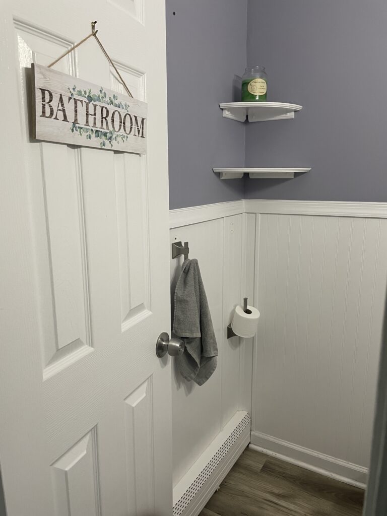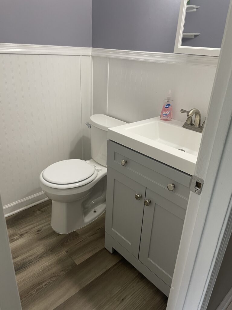 I finished the Master Bath…recaulked the shower, put in new flooring, pedastal sink, new medicine cabinet and new light strip and replaced switch and GFCI.