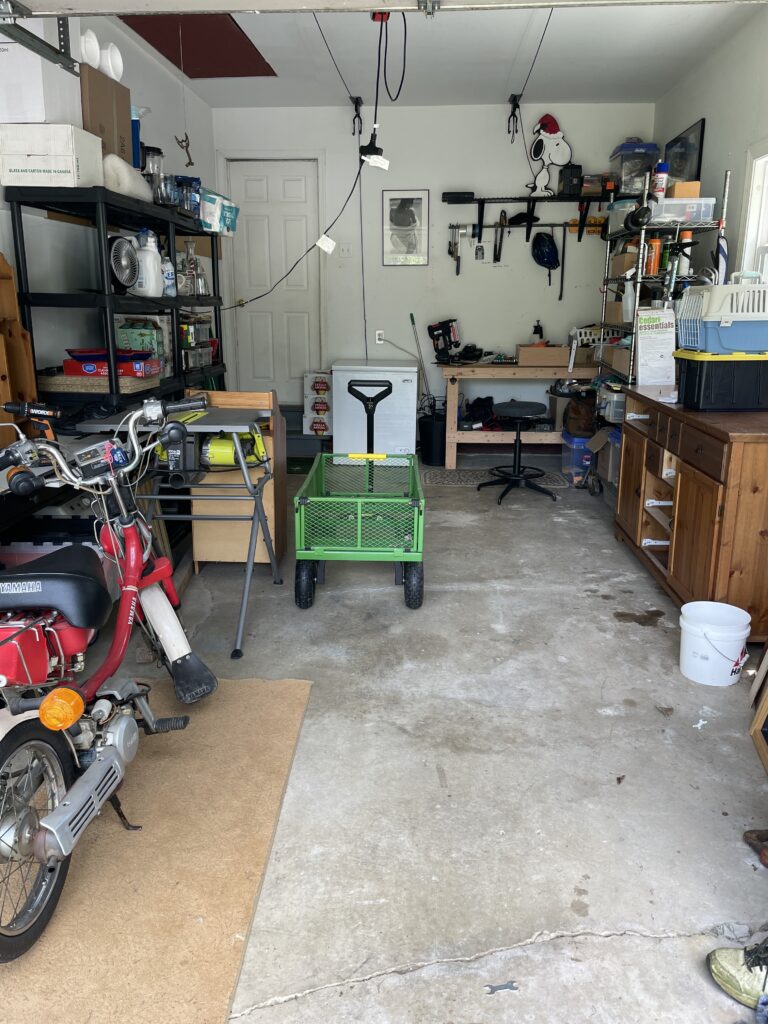 The garage is my “she-shed”…so far, I have added the shelves on the left, the workbench, the shelves over the workbench and a retractable extension cord from the ceiling. As far as the ‘organization’ of it, it is an ongoing project! I really need to figure out how to get everything OFF of the workbench so I can use it!